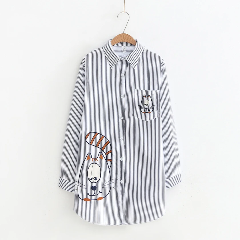 Best New Arrival Big Face Cat Embroidery Long White Blouse Casual Striped Dot Cotton Shirt Loose Plus Si