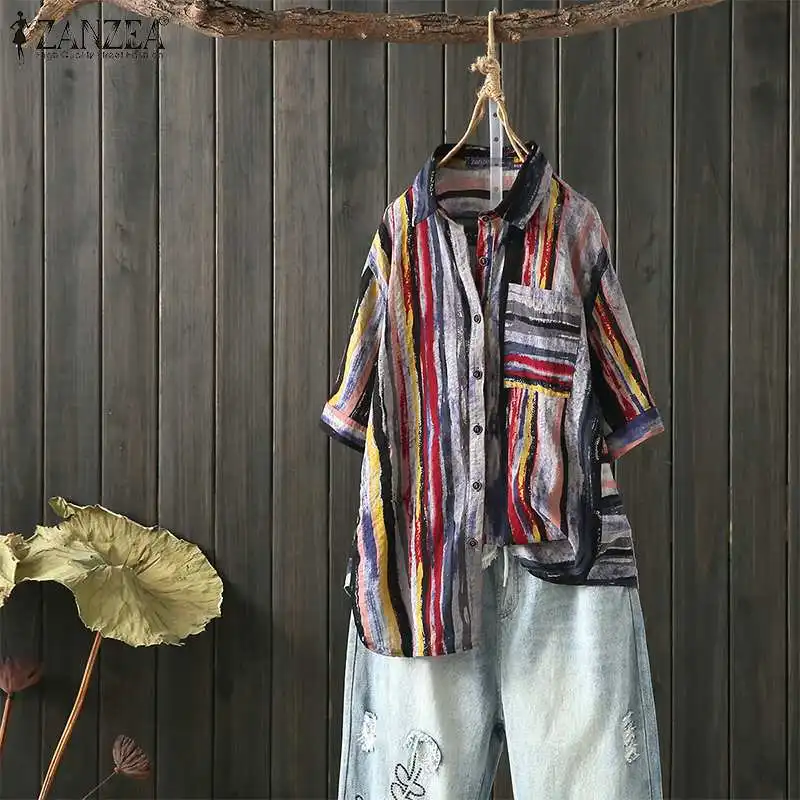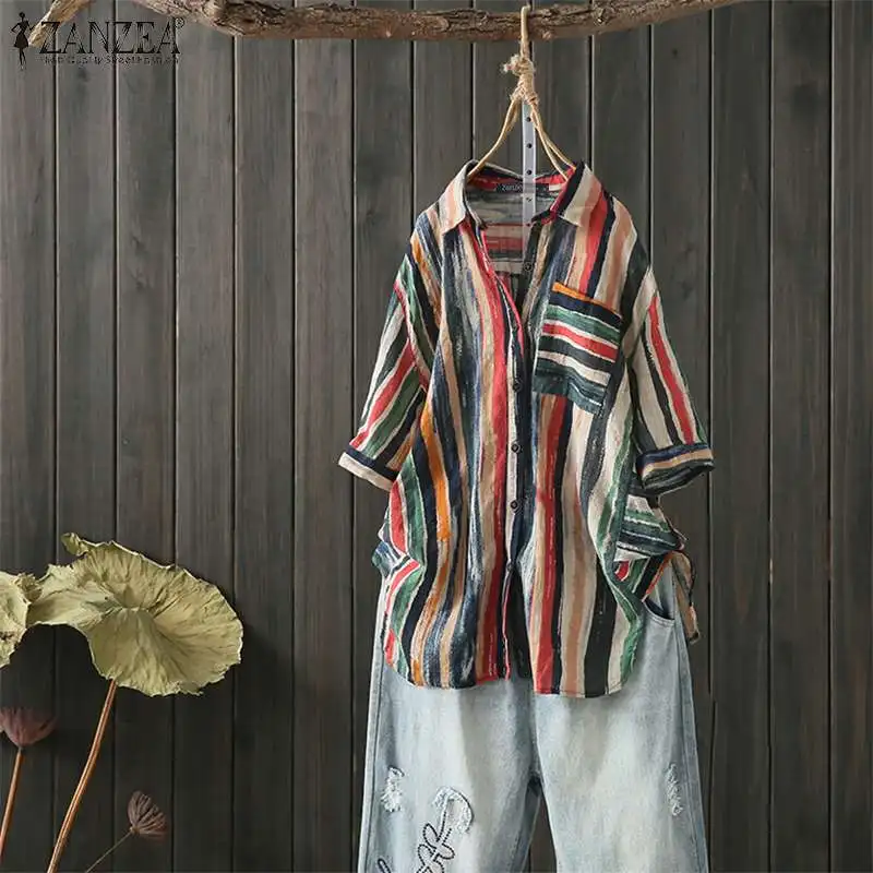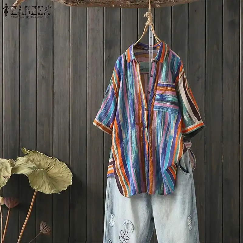 Buy ZANZEA Women Vintage Striped Blouse Summer Lapel Neck Short Sleeve Shirt Femme Robe Buttons Down Bl