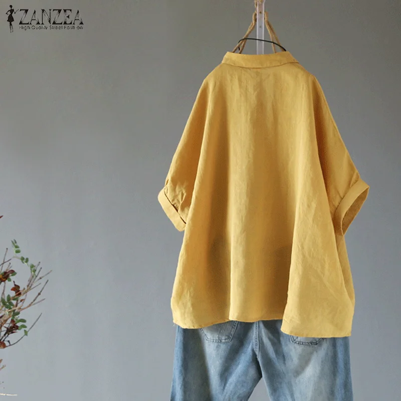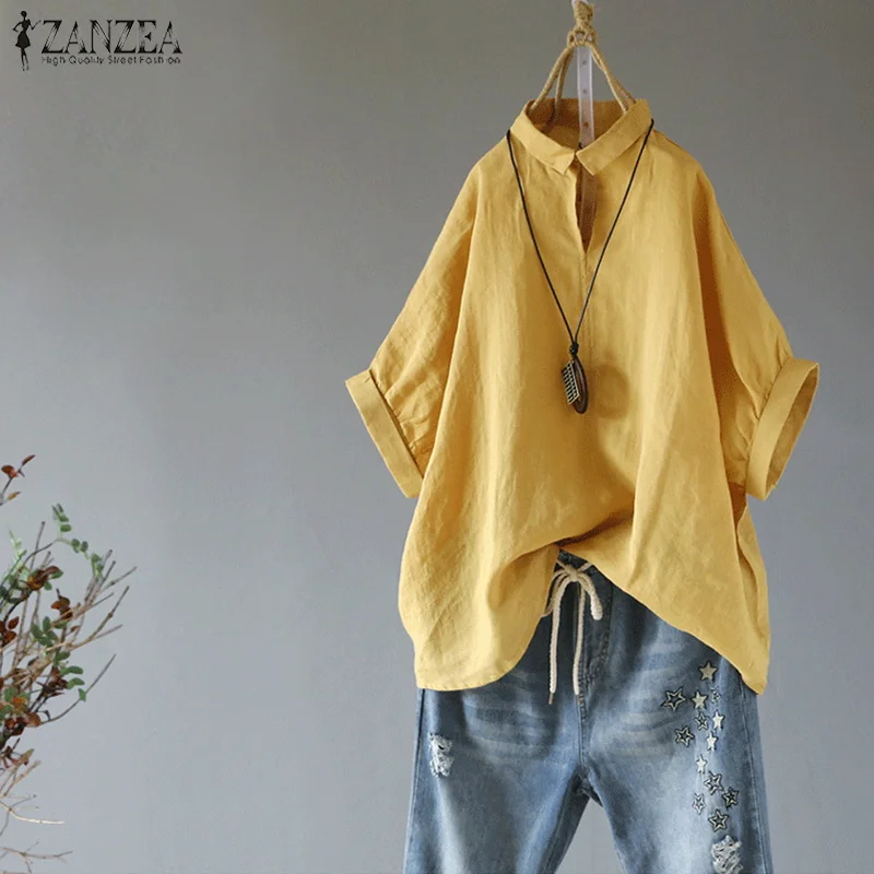 Best 2019 ZANZEA Summer Lapel Neck Solid Blouse Women Short Sleeve Cotton Linen Top Female Casual Loose