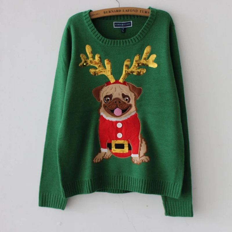 New Ugly Sweater Christmas Sweater Women Green Pug Dog Embroidery Sequins Long Sleeve Pullover Knitted