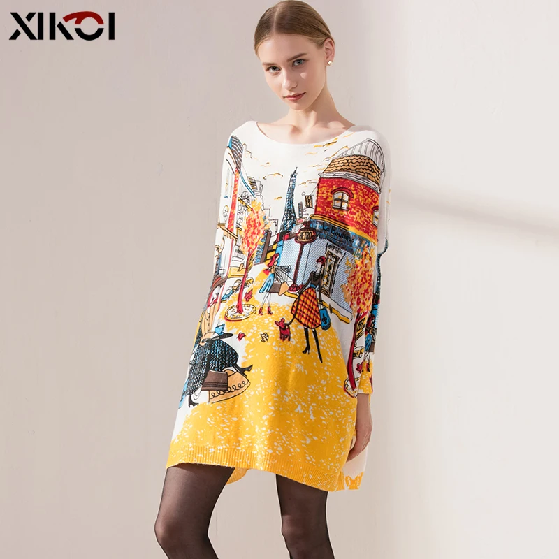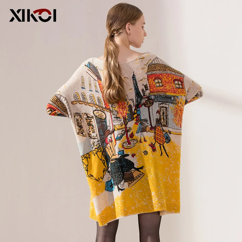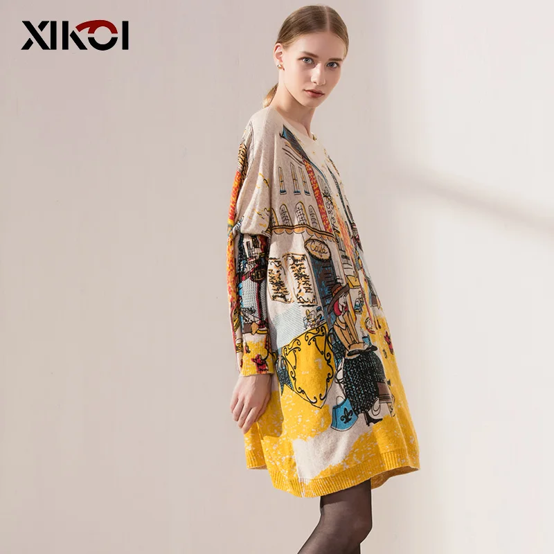 Promo XIKOI Women New Knitted Oversized Sweaters Dress Novel Elegant Ladies Print Winter Warm Long Pullov